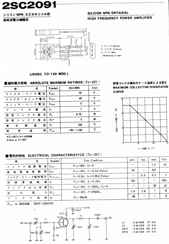 2SC2091 Transistor ( NPN ) Posted on March 26, 2021January 2, 2015 by 1pico Part Number : 2SC2091 Function : NPN SILICON TRANSISTOR Manufacturer : Unspecified Pinout : Description Datasheet PDF Download Other datasheets in the file : 2SC2091,C2091