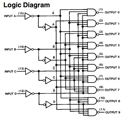 These BCD-to-decimal decoders consist of eight inverters and ten, four-input NAND gates. The inverters are connected in pairs to make BCD input data available for decoding by the NAND gates. Full decoding of input logic ensures that all outputs remain off for all invalid (10± 15) input conditions.