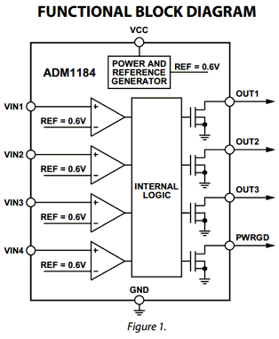 The ADM1184 is an integrated, 4-channel voltage-monitoring device. A 2.7 V to 5.5 V power supply is required on the VCC pin to power the device.