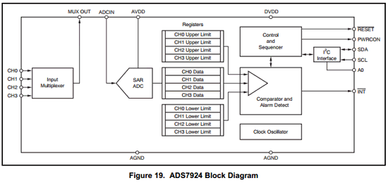 The ADS7924 is a four-channel, 12-bit, analog-to-digital converter (ADC) with an I2C interface.