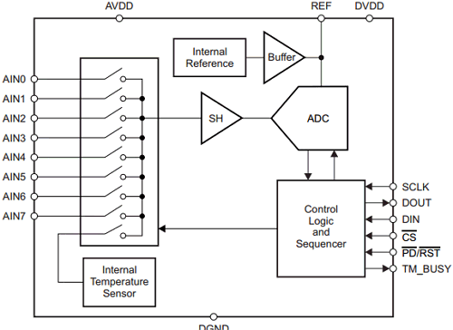 The ADS8028 is a 12-bit analog-to-digital converter (ADC), capable of operating at sampling speeds up to 1 MSPS. The device is based on a successive approximation register (SAR) core and provides an inherent sample-and-hold (SH) front-end.