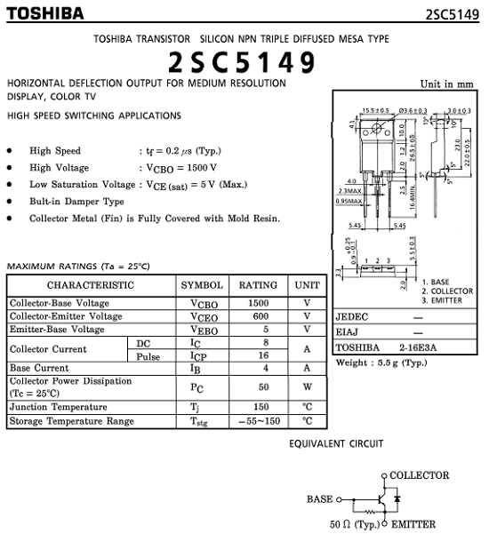 C5149 Schematic Posted on March 26, 2021January 2, 2015 by 1pico Part Number : C5149 Function : NPN TRIPLE DIFFUSED TYPE (POWER AMPLIFIER APPLICATIONS) Manufacturer : Toshiba Pinout : Description Datasheet PDF Download Other datasheets in the file : 2SC5149,C5149