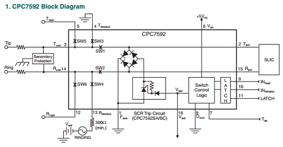 It provides the necessary functions to replace two 2-Form-C electro-mechanical relays used on traditional analog and contemporary integrated voice and data (IVD) line cards found in Central Office, Access, and PBX equipment. Because this device contains solid state switches for tip and ring line break, ringing injection/return, and test access, it needs only a +5V supply for operation and logic-level inputs for control.