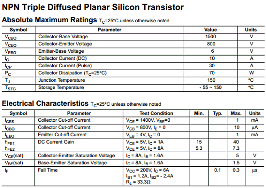 KSD5703 = Vcbo1500 V.- Vceo 800 V.- Ic 10 A. -70 W.
