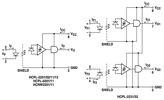 The HCPL-22XX, HCPL-02XX, and HCNW22XX are optically-coupled logic gates. The HCPL-22XX, and HCPL-02XX contain a GaAsP LED while the HCNW22XX contains an AlGaAs LED. The detectors have totem pole output stages and optical receiver input stages with built-in Schmitt triggers to provide logic-compatible waveforms, eliminating the need for additional waveshaping.