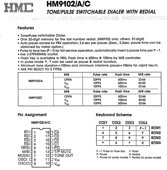 Function  : (HM9102C) TONE/PULSE SWITCHABLE DIALER WITH REDIAL