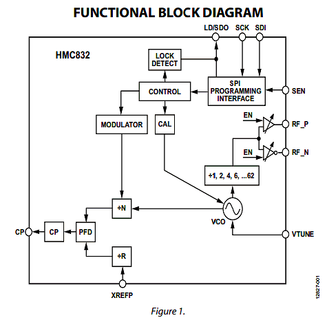 The HMC832 is a 3.3 V, high performance, wideband, fractional-N, phase-locked loop (PLL) that features an integrated voltage controlled oscillator (VCO) with a fundamental frequency of 1500 MHz to 3000 MHz, and an integrated VCO output divider (divide by 1/2/4/6/…60/62), that enables the HMC832 to generate continuous frequencies from 25 MHz to 3000 MHz. The integrated phase detector (PD) and delta-sigma (Δ-Σ) modulator, capable of operating at up to 100 MHz, permit wider loop bandwidths and faster frequency tuning with excellent spectral performance.