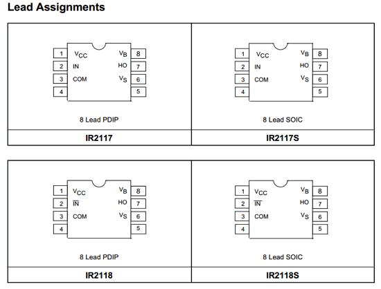 The IR2117/IR2118(S) is a high voltage, high speed power MOSFET and IGBT driver. Proprietary HVIC and latch immune CMOS technologies enable ruggedized monolithic construction. The logic input is compatible with standard CMOS outputs.