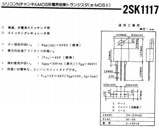 K1117 Schematic Posted on March 26, 2021February 4, 2015 by 1pico Part Number : K1117 Function :2SK1117, K1117 / V dss = 600V Manufacturer : Toshiba Pinout : Description Datasheet PDF Download Other datasheets in the file : 2SK1117, K1117