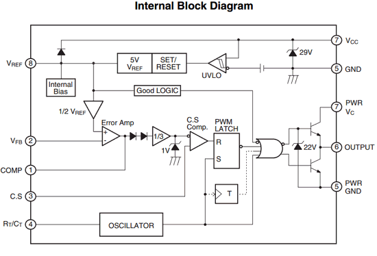 The KA3842AC/KA3842AE are fixed PWM controllers for Off Line and DC to DC converter applications. The internal circuits include UVLO, low start up current, temperature compensated reference, high gain error amplifier, current sensing comparator, and high current totem pole output for driving a POWER MOSFET.