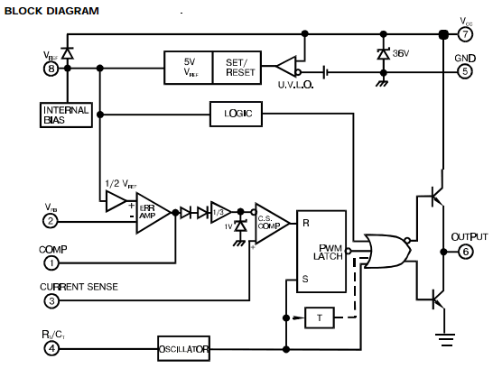 The KA3842A are fixe frequency current-mode PWM controller. They are specially designed for OFF-Line and DC-to-DC converter applications with minimal external components. These integrated circuits feature a trimmed oscillator for precise duty cycle control, a temperature compensated reference, high gain error amplifier, current sensing comparator, and a high current totempole output ideally suited for driving a power MOSFET.