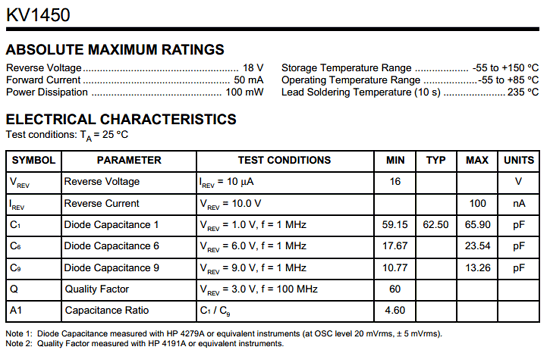 The KV1450 variable capacitance diode was specially made to be used as tuning elements in car radios, radio cassettes, stereos, and other consumer radios. The KV1450 is suitable for wide band tuning from 76 to 108 MHz.