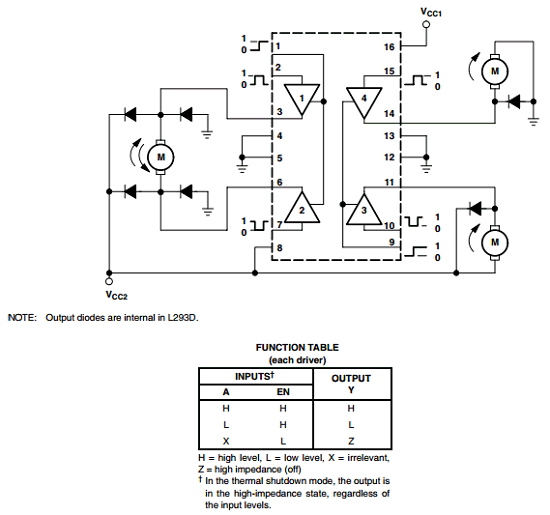 The L293 and L293D are quadruple high-current half-H drivers. The L293 is designed to provide bidirectional drive currents of up to 1 A at voltages from 4.5 V to 36 V. The L293D is designed to provide bidirectional drive currents of up to 600-mA at voltages from 4.5 V to 36 V.