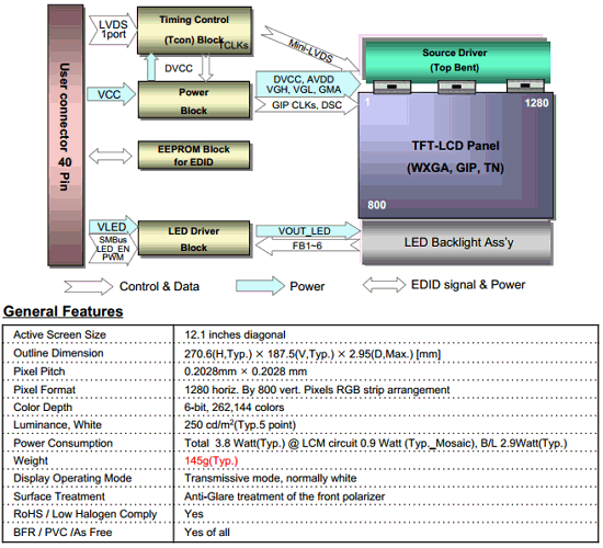 The LP121WX4 is a Color Active Matrix Liquid Crystal Display with an integral LED backlight system. The matrix employs a-Si Thin Film Transistor as the activeelement. It is a transmissive type display operating in the normally white mode. This TFT-LCD has 12.1 inches diagonally measured active display area with WXGA resolution (1280 horizontal by 800 vertical pixel array).