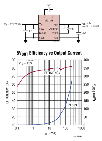 The LTC3245 is a switched capacitor buck-boost DC/DC converter that produces a regulated output (3.3V, 5V or adjustable) from a 2.7V to 38V input.