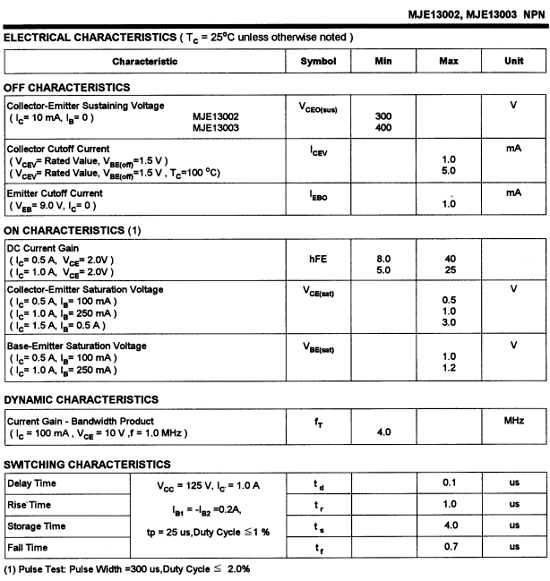 * Collector-Emitter Sustaining Voltage V ceo(sus) = MJE13003 : 400V and MJE13002 : 300V