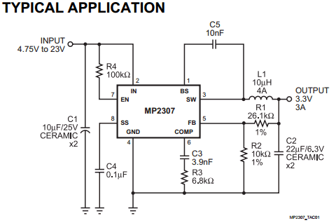 The MP2307 is a monolithic synchronous buck regulator. The device integrates 100mΩ MOSFETS that provide 3A of continuous load current over a wide operating input voltage of 4.75V to 23V.
