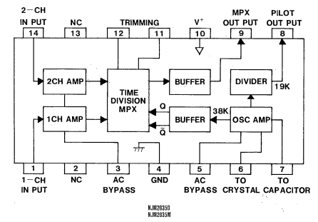 The NJM2035 is an integrated circuit used to generate a stereo composite signal and obtain switching output and 19kHz pilot signal due to two input audio signal and 38kHz X-tal and a few external CR.