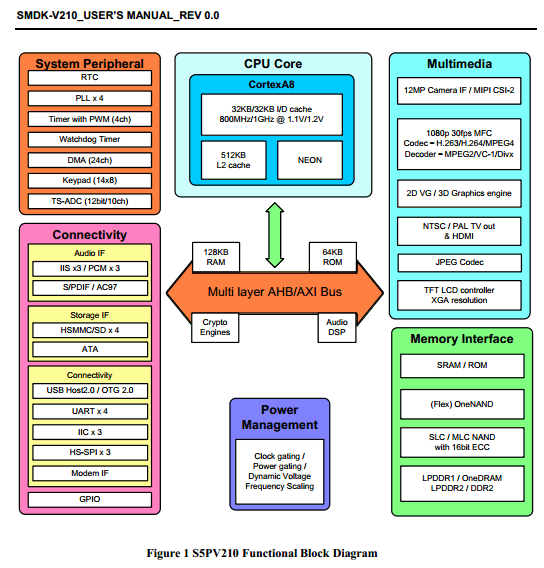 The S5PV210 is a 32-bit RISC cost-effective, low power, high performance microprocessor solution for mobile phones and general applications, and integrates an ARM Cortex-A8 which implements the ARM architecture V7-A with supporting numerous peripherals.
