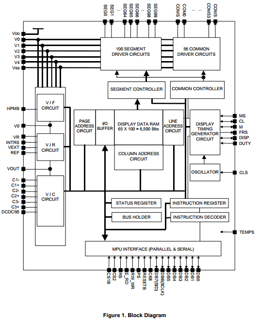 It provides a high-flexible display section due to 1-to-1 correspondence between on-chip display data RAM bits and LCD panel pixels. And it performs display data RAM read/write operation with no external operating clock to minimize power consumption.
