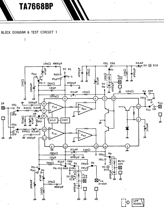 The TA7668BP is a dual preamplifier with ALC and muting designed for use in record/playback amplifier of the recorder.