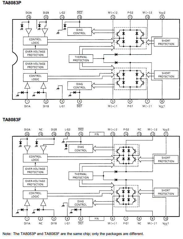 The TA8083P、TA8083F contains two motor driver circuits with a current capacity of 0.5A for directly driving bidirectional DC motors. Inputs DI1 A / B and DI2 A / B are combined to select one of forward, reverse Stop, and brake modes. Since the inputs are TTL-Compatible, this IC can be controlled directly from a CPU or other control system. In addition, the IC also has a low standby current function, a self-diagnostic function, and various protective functions.