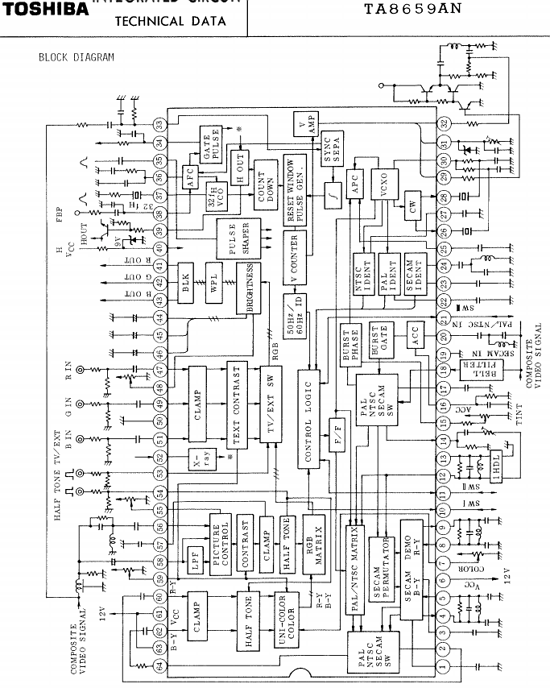 The TA8659AN is an NTSC/PAL/SECAM video-chroma-deflection sub-system with the teletext interface circuit.