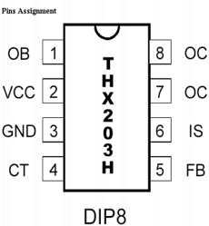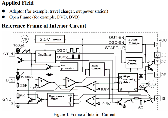 PWM controller of high-performance current mode is specially designed for AC/DC transformer with high performance and price ratio, which supplies continuous output power of 12W within the range of wide-voltage between 85V and 265V, the output power of peak value can be up to 18W. The combination of optimized reasonable circuit design and bipolar facture technology with high performance and price ratio economizes the whole cost ultimately.