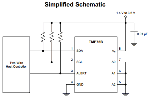 The TMP75B is an integrated digital temperature sensor with a 12-bit analog-to-digital converter (ADC) that can operate at a 1.8-V supply, and is pin and register compatible with the industry-standard LM75 and TMP75. This device is available in SOIC-8 and VSSOP-8 packages, and requires no external components to sense the temperature.