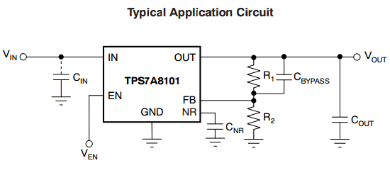 The TPS7A8101 low-dropout linear regulator (LDO) offers very good performance in noise and power-supply rejection ratio (PSRR) at the output. This LDO uses an advanced BiCMOS process and a PMOSFET pass device to achieve very low noise, excellent transient response, and excellent PSRR performance.