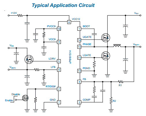 The uP6161 integrates a high performance synchronous rectified buck controller and a linear-regulator controller. This part works with a single +12V supply voltage and delivers two high quality output voltages for both processing unit and memory unit. An internal linear regulator provides optimum 9V drive voltage for efficiency and thermal management.