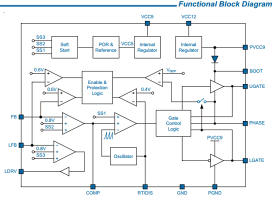 Function : Single 12V Input Supply Dual Regulator Synchronous Buck PWM and Linear Regulator Controller